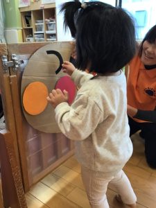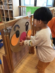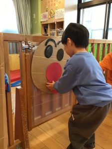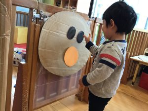 また、アンパンマンの福笑いを使って英語で発音した顔のパーツを貼って![]()