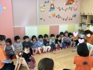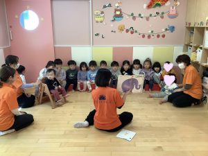 「うわ〜!」と倒れるシーンでは子どもたちも一緒に倒れて見たり「重いなぁ」とセリフを言ってみたり…内容も覚えるくらい大好きな絵本にとっても集中してみていた乳児クラスの子どもたちでした![]()
