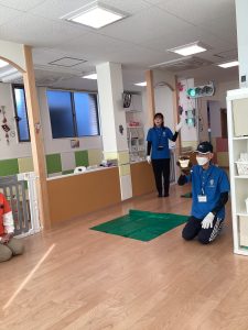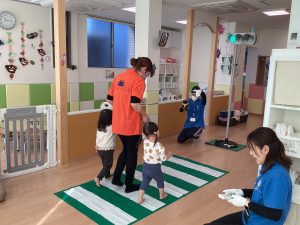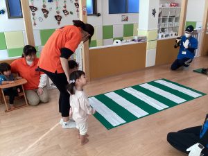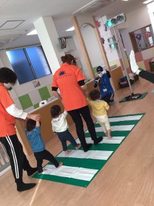 お話の後は、実際に保育者と手を繋いで、手をあげて横断歩道を渡りました![]()