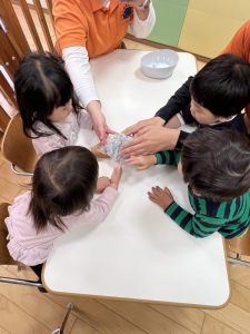 今回は2歳児クラスで「やさしいってなぁに?」をテーマに活動を行いました。