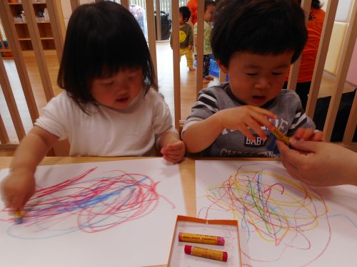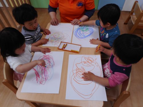 4人のお友だちは、腕を大きく動かして紙いっぱいに思い切り描いていますね。