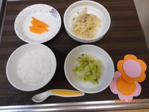 2018-04-23 4月23日(月)のお給食 Category:給食ピックアップ <幼児食> *ご飯 *ツナスパゲッティ *コンソメスープ *ドレッシングあえ *バナナ <離乳食・後期> *おかゆ *マカロニとツナの煮物 *キャベツときゅうりのだし煮 *にんじんの煮物 *ミルク100cc