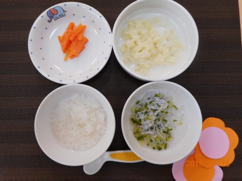 2018-04-25 4月25日(水)のお給食 Category:給食ピックアップ <幼児食> *カレーライス *きゅうりのあえもの *いちご <離乳食・後期> *おかゆ *じゃがいもの煮物 *しらすときゅうりのだし煮 *にんじんの煮物 *ミルク100cc