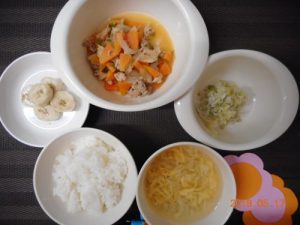 <幼児食> *ごはん *キャベツのあえ物 *酢豚風ソテー *コンソメスープ *バナナ ...