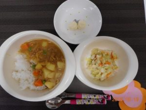 <幼児食> *ごはん *カレーシチュー *キャベツの胡麻ネーズあえ *チーズ