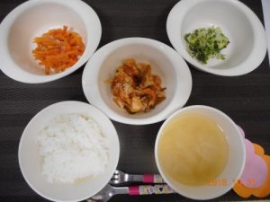 <幼児食> *ごはん *みそ汁 *鶏肉の炒め煮 *さつま芋の甘煮 *おかか和え