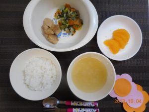 <幼児食> *ごはん *みそ汁 *チキンソテー *野菜炒め *みかん缶