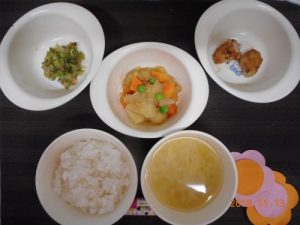<幼児食> *ごはん *みそ汁 *豚肉のケチャップからめ *切昆布の煮物 *こふき芋