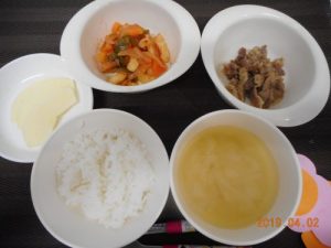 <幼児食> *ご飯 *みそ汁 *豚肉のみそ焼き *マカロニソテー *りんご