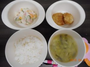 <幼児食> *ご飯 *みそ汁 *豆腐のつくね焼き *ポテトサラダ