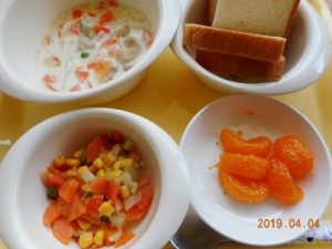 <幼児食> *食パン *クリームシチュー *キャベツの味噌ドレサラダ *みかん缶