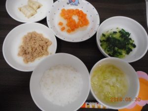 <乳児食> *軟飯 *みそ汁 *魚の唐揚げ *ポテトサラダ *おかか和え <幼児食> ...