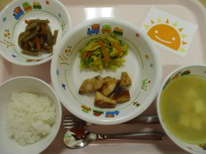 ご飯 味噌汁 魚の照り焼き きんぴらごぼう キャベツのソテー(カレー味)