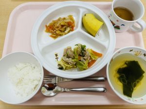 ご飯 すまし汁 豚肉とキャベツのみそ炒め 切干大根の煮物 バナナ