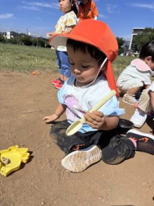 砂の上に座り込んでスプーンでお砂を掘り返しています❗️