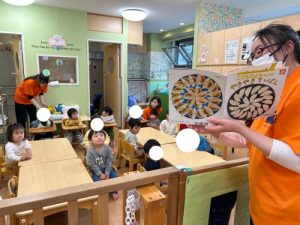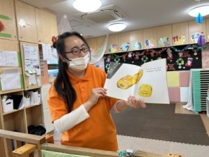 子ども達もページをめくるたび「あ!」と美味しそうな食べ物に反応し集中し絵本に夢中の子ども達!見ているこちらも美味しそうな食べ物にお腹が空いてきますね。