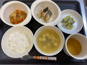 ご飯 味噌汁 さばの塩焼き じゃが芋の含め煮 キウイ