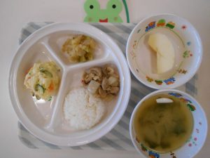ご飯・味噌汁・焼肉・ポテトサラダ・おかか和え・りんご