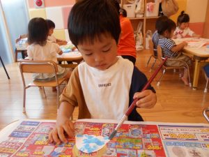 (みんながお絵描きした絵を保育士がチョキチョキと切って…アイスクリーム型に変身!!)