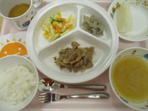 ご飯 味噌汁 豚焼肉 マカロニサラダ れんこん金平 梨