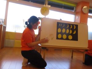 改めて月の満ち欠けについてお話をすると、だんだんと大きくなっていくお月さまに『お~!!』と歓声をあげていました