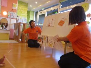『十五夜でお供えするものは?』『お月さまの中でうさぎは何をしてる??』など2択クイズに子どもたちも悩みながら手を挙げていました