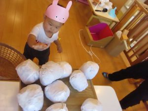 保育園でもみんなが作ったぶどうやきのこ、かぼちゃなどを飾って十五夜会をしました🎑