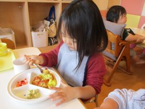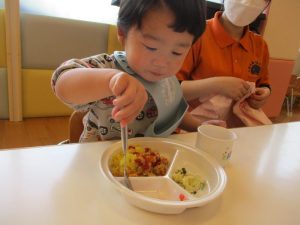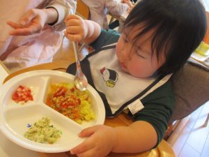 『おに』と聞いてちょっと不安そうにしていた子どもも、にっこり笑う鬼を見てホッとしたのか、モリモリ食べていました
