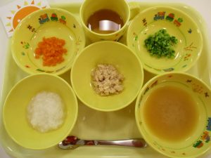 粥 味噌汁 煮魚 ゆでブロッコリー ゆでにんじん