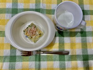 粥 味噌汁(じゃが芋・玉ねぎ) 煮魚(たら) くず煮(きゅうり・人参) バナナ