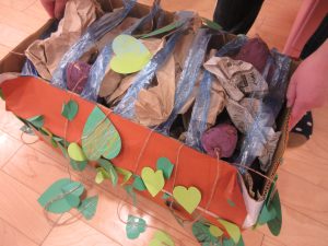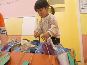 食育をする1週間ほど前に、子どもたちが新聞紙を千切ったり丸めたり、画用紙に色をつけたりしました♪