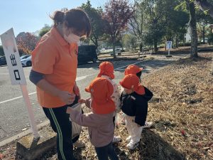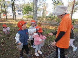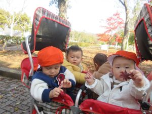 どんぐりやいろんな形の葉っぱを見つけた1.2歳児さんは保育者に自慢してとっても嬉しそうでした!それぞれで好きなだけ袋に秋を詰め込んで、保育者やお友だちと一緒に秋を味わっていましたよ🍁