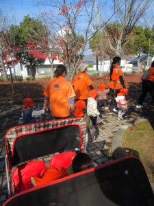 一緒にいきながら、聞こえてくる車の音に反応する子どもたちは指を指したり、「あ!あ!」と声を出したりして行き道も発見を楽しんでいました。2歳児さんは上手に手をつないで歩いていけるようにもなり、保育者に「どこいくの〜」と歩きながら尋ねながら、楽しみにしていましたよ!