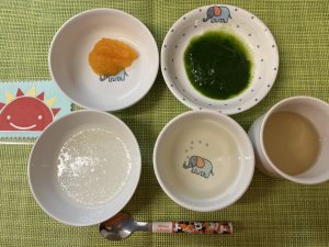 (写真は離乳食後期です。年齢によって形、固さ、盛り付け量を変えて、提供しています。)