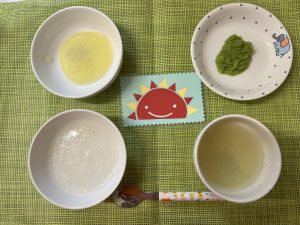 (写真は後期食です。月齢によって形、固さ、盛り付け量を変えて提供しています。)