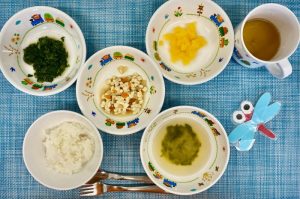 (写真は離乳食後期です。年齢によって形、固さ、盛り付け量を変えて、提供しています。)