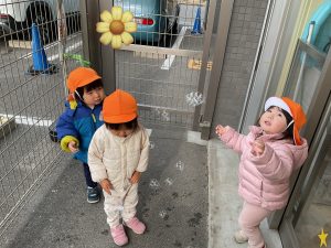 先生が吹いたシャボン玉に興味津々のいちご組さん、触ろうと頑張っていました♪