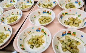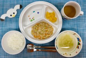 (写真は離乳食後期です。年齢によって形、固さ、盛り付け量を変えて、提供しています。)