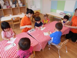 そこで、今日はリトミックと6月10日『時の記念日』にちなみ制作を始めました。出来上がりまではもうしばらく時間がかかりそうですが、日々完成に向けて子どもたちと楽しく活動していきたいと思います。