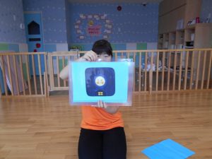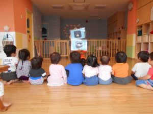スタッフのアイディアで、『おつきさまこんばんは』という絵本を子どもたちがみやすいようにと少しおおきくして紙芝居にしました。