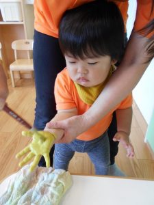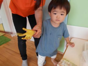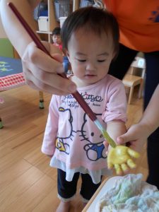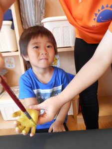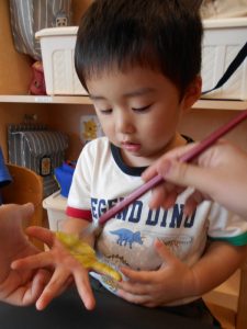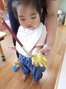 絵具の筆先がくすぐったくてなんだか気持ちいいと?ニコニコの笑顔です