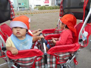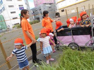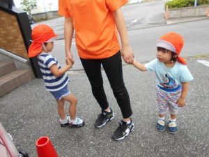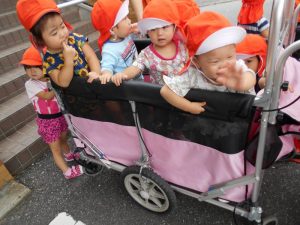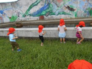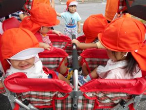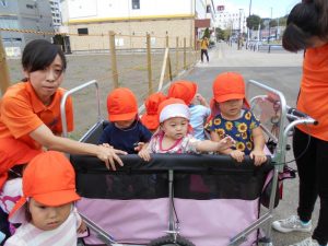 さてさて、秋の心地よい風が吹く中園外でのお散歩を楽しむ君津園の子どもたちです。