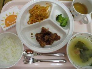 ご飯 味噌汁 ヒレカツ スパゲティソテー ブロッコリーの塩茹で