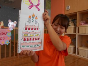 そして、おやつの時は先生がデコレーションケーキ?を作ってくれ大喜びの子どもたちでした。