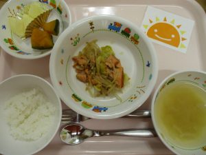ご飯 味噌汁 鮭のちゃんちゃん焼き かぼちゃの甘煮 りんご