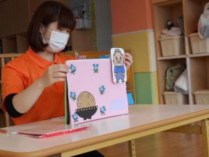 スタッフ手作りの『おむすびころりん』スケッチブックシアターのはじまりです