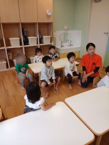 「やってきたのはどんなくるま?」の問いかけに、子どもたちの自由な答えが賑やかに返ってきました。