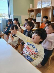 空飛ぶワンピースちゃんと一緒に冒険しているような気持ちで、絵本を見守る子どもたち。