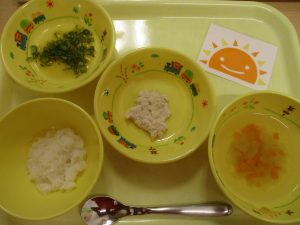 粥 野菜スープ(たまねぎ・にんじん) ささみペースト いんげんの煮浸し