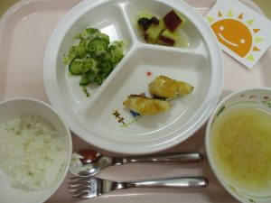 ご飯 味噌汁 魚のみそ焼き さつま芋の甘煮 キャベツときゅうりのゆかり和え